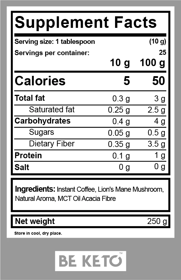 Brain Fuel premium pulverkaffe med MCT-olje & Lion’s Mane, med smak av fransk vanilje.