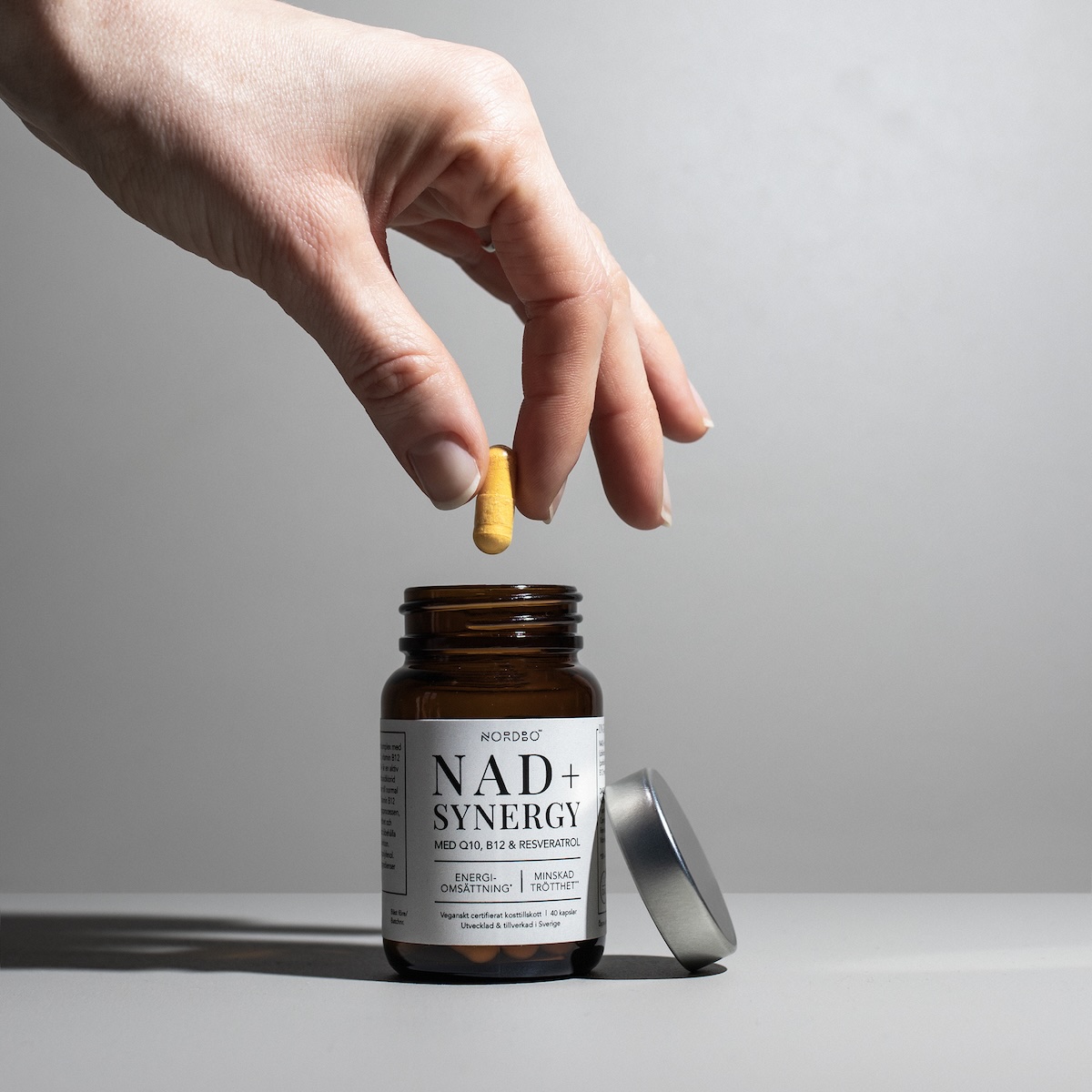 NAD+ Synergy er utviklet etter The Nordbo Way: en hero-ingrediens (NR), en team-ingrediens (Q10) og to supporters (B12 og Resveratrol) som jobber i synergi. Produktet er vegansk sertifisert, produsert med bærekraftig emballasje og holder høy kvalitet på alle ingredienser.