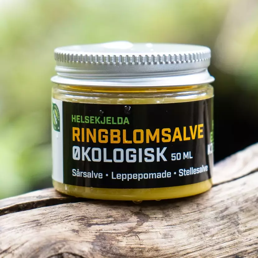 Ringblomstsalve fra Helsekjelda er en mild og effektiv hudsalve laget av økologiske ingredienser. Ringblomst (Calendula officinalis) er kjent for sine antiseptiske og sårhelende egenskaper. Den inneholder virkestoffet calendulin, som bidrar til raskere heling av sår og irritert hud.
